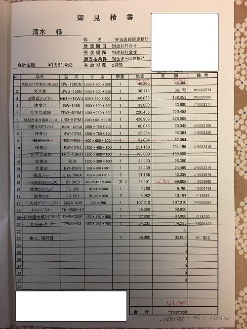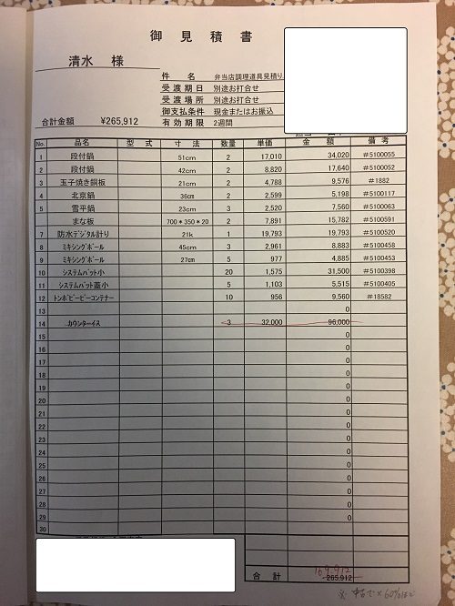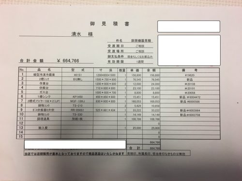 調理小物を除いて全部で20点ほどでした。この書き出した紙を持って近所の店舗用品専門店「テンポスバスターズ」に行って見積もりを出してもらいました。